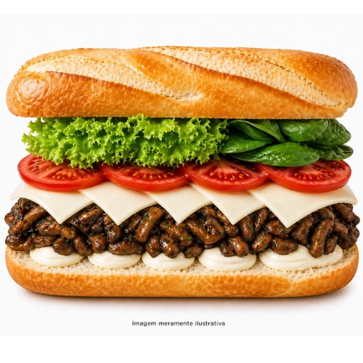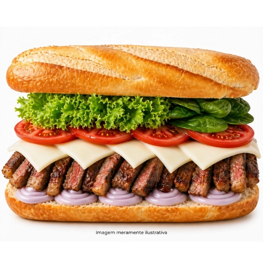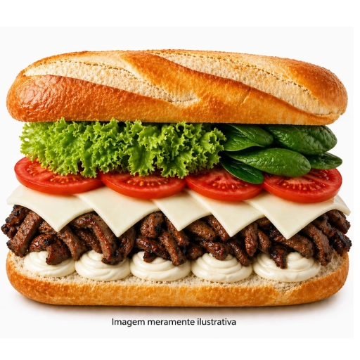 Baguete, maionese de azeitona preta, picanha, mussarela, tomate, alface ou rúcula