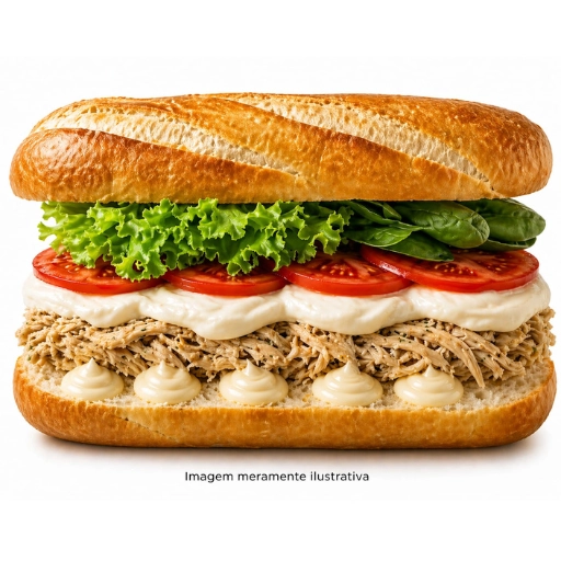 Baguete, maionese da casa, frango desfiado, requeijão, tomate, alface ou rúcula.