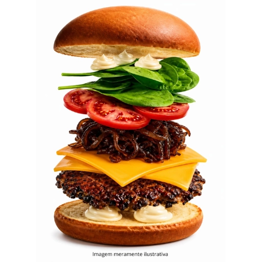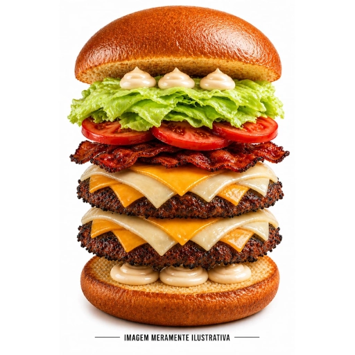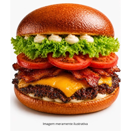 Pão, 2 hambúrgueres artesanais 110g, maionese da casa, cheddar, queijo prato, mussarela, bacon fatiado, tomate e alfac... Ver completo