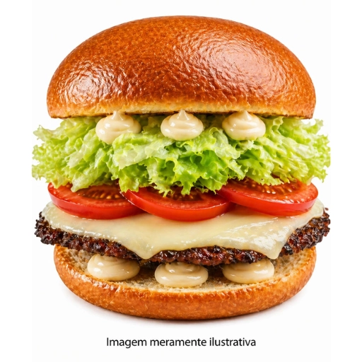 Pão, hambúrguer simples, maionese Vigor, mussarela, tomate e alface.