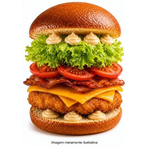 Pão, hambúrguer de frango empanado e frito, bacon fatiado, cheddar, maionese da casa, alface e tomate.