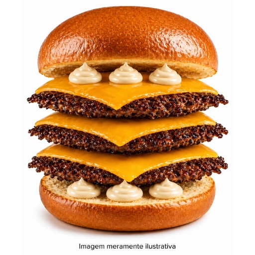 Pão, 3 hambúrgueres artesanais (100g cada), maionese da casa e cheddar.