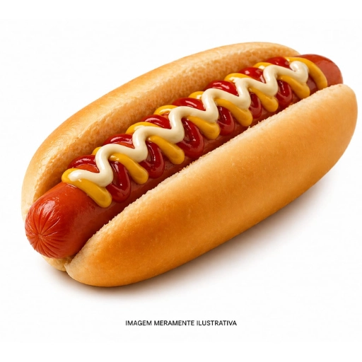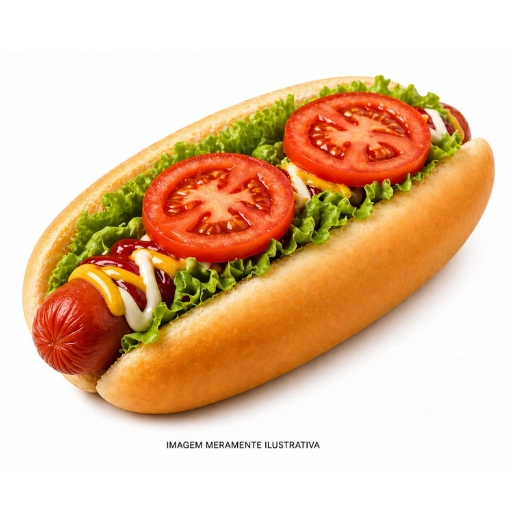 Pão, uma salsicha, ketchup, mostarda, maionese Vigor e salada (alface e tomate).
