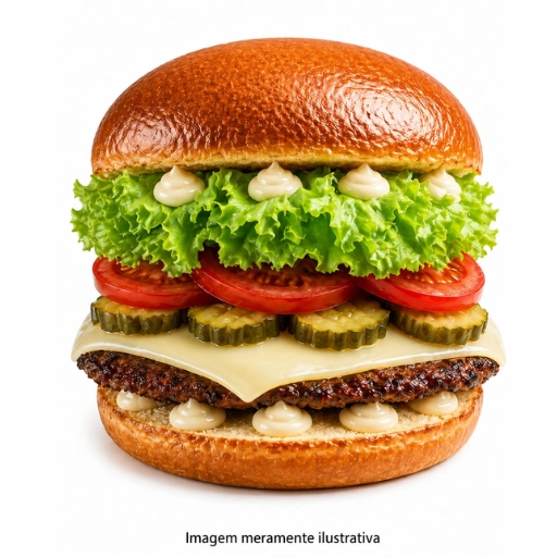 Pão, hambúrguer artesanal 110g, maionese da casa, cheddar, bacon fatiado, tomate e alface