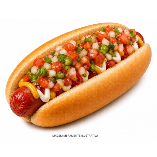 Pão, uma salsicha, ketchup, mostarda, maionese Vigor e vinagrete.