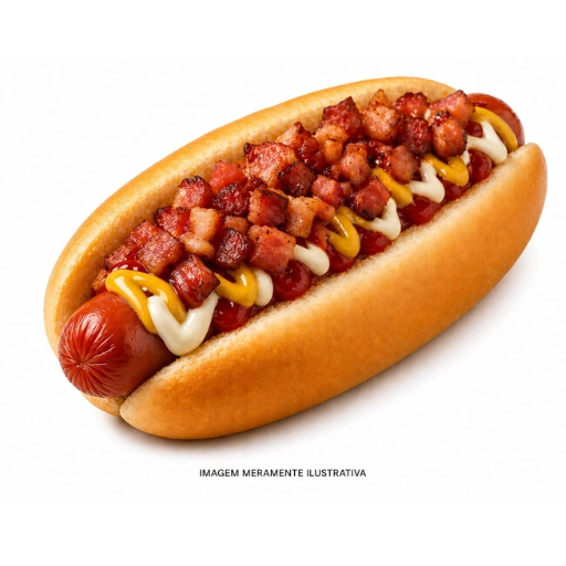 Pão, uma salsicha, ketchup, mostarda, maionese Vigor e bacon em cubos.