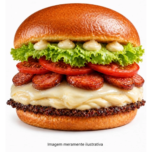 Pão, hambúrguer artesanal 110g, maionese da casa, requeijão cremoso, calabresa, mussarela, tomate e alface.