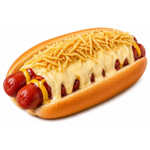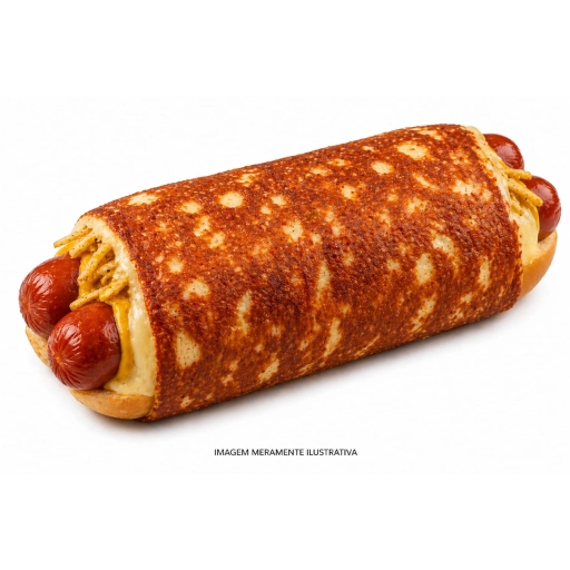 Pão, duas salsichas, ketchup, mostarda, maionese da casa, muçarela, batata palha e crostinha de muçarela por fora.