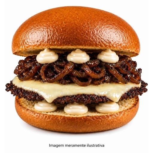 Pão, hambúrguer artesanal 110g, maionese da casa, mussarela e cebola roxa reduzida no shoyu (não caramelizada).