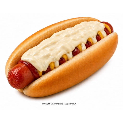 Pão, uma salsicha, ketchup, mostarda, maionese Vigor e requeijão cremoso.